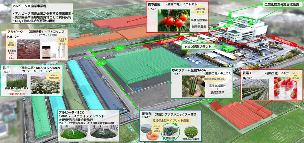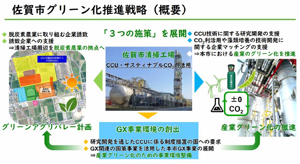 佐賀市は、「脱炭素」と「経済成長」が両立する社会を創出するGX(グリーン・トランスフォーメーション)の実現に向けて、「佐賀市グリーン化推進戦略」を2024年11月策定した。清掃工場の排ガスから分離回収したCO2を藻類培養や農業に活用し、産業の育成をはかるCO2分離回収利活用事業(CCU事業)を核に、佐賀市に民間事業者の脱炭素化に関する投資を呼び込むことを目指すものである。