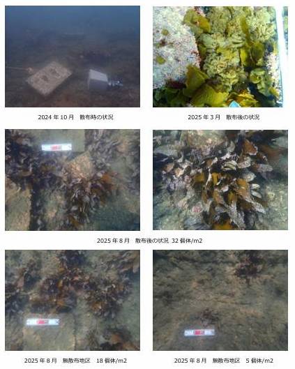 千葉県の内房においてカジメ・アラメを対象とし、本実証は数回実施された。2024年10月に水深約3mの岩盤に対して本手法を行った地点について2025年8月に追跡調査を行ったところ、1平方メートルあたりのアラメの密度は、無散布地点に比べ散布地点では1.78-6.4倍と高い数値となった。同地点では周囲にアラメが確認されていることから散布とは関係ない天然由来のアラメもあるものの、本手法の効果があったものと考えられる。