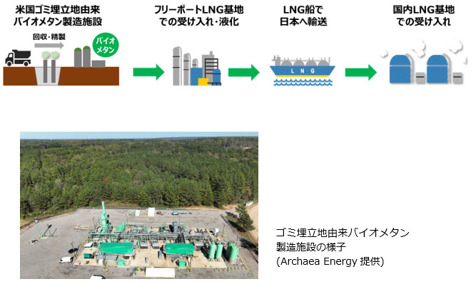 本契約の締結により、大阪ガスはArchaea Energy が米国内に保有するゴミ埋立地由来バイオメタン製造施設から、バイオメタン(約2.6万Nm3(約20トン))を購入する。購入したバイオメタンはフリーポートLNG基地にて液化の上、出荷し、同社が関西に保有するLNG基地での受け入れを予定している。なお、当該米国バイオメタン製造事業から生み出される環境価値を付与した都市ガスは、関西のお客さま施設において利用される予定である。
