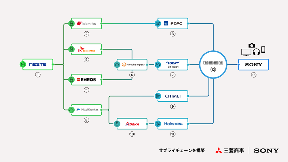 ① Neste Corporation:リニューアブルナフサを製造 / ② 出光興産㈱:リニューアブルスチレンモノマーを製造 / ③ Formosa Chemicals & Fibre Corporation:リニューアブルポリスチレン樹脂を製造 / ④ SK Geo Centric Co., Ltd.:リニューアブルパラキシレンを製造 / ⑤ ENEOS㈱:リニューアブルパラキシレンを製造 / ⑥ Hanwha Impact Corporation:リニューアブルテレフタル酸を製造 / ⑦ Toray Advanced Materials Korea Inc.:リニューアブルPET 樹脂と原反を製造 / ⑧ 三井化学㈱:リニューアブルビスフェノールA を製造 / ⑨ CHIMEI Corporation:リニューアブルポリカーボネート樹脂を製造 / ⑩ ㈱ADEKA:リニューアブル難燃剤を製造 / ⑪Qingdao Haier New Material Development Co., Ltd.:リニューアブルポリカABS 樹脂を製造 / ⑫ 成形メーカー / ⑬ ソニー㈱:デザイン・製品化