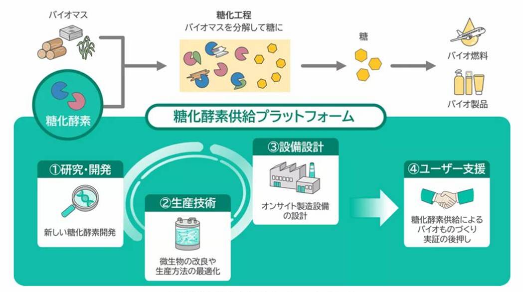 「バイオものづくり革命推進事業」は、古紙やパルプ、食品残渣など未利用バイオマス資源を原料に、微生物などの働きを活用して有用な化合物や製品を生み出すことを目的とし、研究開発や実証を支援する取り組み。バイオエタノールやSAF(持続可能な航空燃料)の製造をめざすプロジェクトの多くでは、未利用バイオマスを活用するにあたり、バイオマスを分解して糖に変換する糖化酵素が必要不可欠である。しかしながら、有用な糖化酵素を国内で安定的に供給する体制は十分でなく、整備が課題となっている。