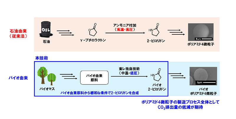 従来、ポリアミド4の原料である2-ピロリドンは、石油由来の原料から製造されてきた。これに対し東レは、糖などの主要バイオマスを起点とした2-ピロリドン合成法の研究開発に取り組み、バイオ由来原料から2-ピロリドンを合成することに成功した。本技術で製造される2-ピロリドンを重合・加工したポリアミド4微粒子は、従来品と変わらない粒径、形状を実現でき、最終製品への影響を与えることなくバイオ原料化することが可能である。加えて本技術は、従来の石油化学プロセスと比較して温和な条件で反応が進行するため、原料からポリアミド4微粒子を製造するまでのプロセス全体として二酸化炭素(CO2)排出量を低減する効果が見込まれる。