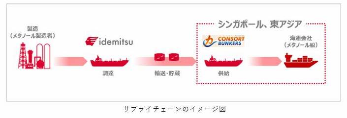出光興産は、船舶燃料としてそのまま使えるだけでなく、ジェット燃料やガソリン、化学原料を製造することができ、多くのセクターの脱炭素化に寄与することができるe-メタノールや、バイオメタノールの供給体制の構築に取り組んでいる。世界有数のバンカリング港であるシンガポールや東アジアの主要港湾などでの燃料バンカリングにおいて豊富な知見と実績を持つConsort Bunkers との共同検討により、将来的なグリーンメタノールの導入も視野に、船舶燃料としてのメタノールのサプライチェーン構築を目指す。