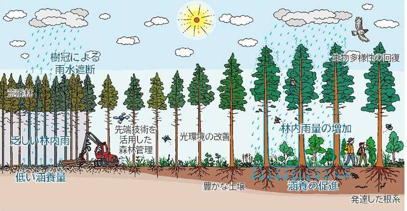近年、気候変動による異常気象や降雨パターンの変化により、森林の水源涵養の機能である洪水リスクの軽減、水質浄化、水の安定供給の3つの役割がこれまで以上に重要視されている。