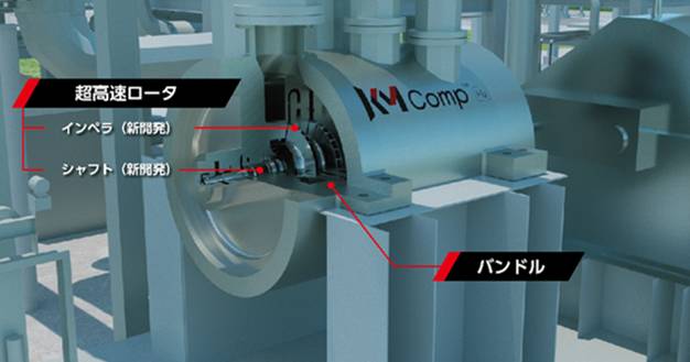 超高速回転が可能な、新開発の遠心式圧縮機を採用することで、既存装置よりも大容量の水素ガスを、限られたスペースで高圧縮できるようになった。これにより、設置面積を既存装置との比較で約7分の1に削減可能。