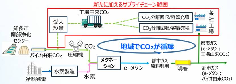 具体的には、アイシン西尾ダイカスト工場(愛知県西尾市)およびデンソー安城製作所(愛知県安城市)において、都市ガス機器の排ガスから分離・回収したCO2をガス容器に充填し、東邦ガス知多e-メタン製造実証設備(愛知県知多市、e-メタン製造設備)へ陸送する。e-メタン製造設備では、陸送されたCO2を原料としてe-メタンを製造し、都市ガス導管網を通じてアイシン・デンソー両社へ供給する予定である。