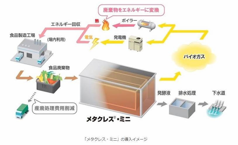 これまで、食品製造工場や商業施設などから排出された少量のバイオマスのオンサイトでの利活用は、設置スペースの制約や導入費用などの理由から普及が遅れていた。「メタクレス・ミニ」は、高効率な処理性能を有しながら、装置のサイズがコンパクトであるため小スペースに設置できることが最大の特長である。本装置を導入することで、未利用バイオマスからのエネルギー創出とカーボンニュートラルへの取組みを同時に実現できる。