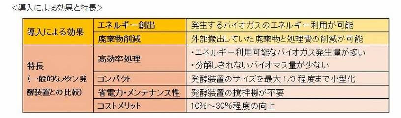 鹿島がこれまで蓄積してきた高温固定床式メタン発酵技術のノウハウと、単独で開発した小型装置向けの新型固定床、ヴァイオスが保有する水処理関連設備の小型化・パッケージ化のノウハウを組み合わせ、コンパクトでありながら高効率処理が可能で、さらに、メンテナンス性にも優れた装置を開発しました。本装置の導入による効果と特長は以下のとおり。